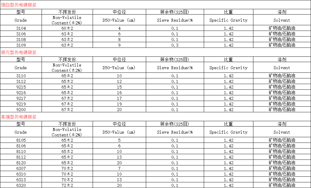 仿電鍍鋁銀漿是集細白銀和閃光銀的優(yōu)點于一體,既有細白銀的遮蓋力和白度,又有閃銀的亮度和閃爍效果,的仿電鍍銀會有鏡面和鍍銘的效果。根據(jù)不同的效果可分為銀元型、細白型和絲光型三類。 主 要 參數(shù)